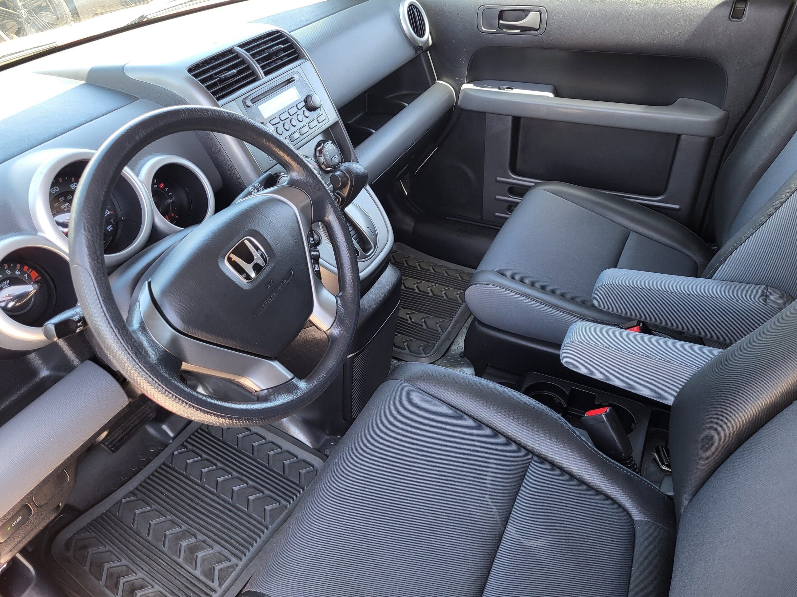 Exterior@2-speed/intermittent windshield wipers~Exterior@Clamshell tailgate~Exterior@Green heat-rejecting glass~Exterior@Intermittent rear window wiper w/washer~Exterior@Metallic-look composite body panels~Exterior@Multi-reflector halogen headlights~Exterior@Pwr mirrors~Exterior@Rear privacy glass~Exterior@Removable rear sunroof w/tilt~Exterior@Swing-wide side cargo doors~Interior@(3) front/(2) rear cup holders~Interior@270-watt AM/FM stereo w/CD player-inc: (7) speakers, subwoofer, mp3/digital media auxiliary jack~Interior@Adjustable steering column~Interior@Air conditioning w/air filtration system~Interior@Cargo area-inc: light, storage bins, (4) tie-downs, (2) hooks~Interior@Color-keyed instrument panel gauges-inc: tachometer, digital odometer, (2) digital trip meters, coolant temp~Interior@Cruise control~Interior@Door pocket storage bins~Interior@Driver seat armrest~Interior@Front passenger-side seatback pocket~Interior@Front/rear 12V accessory outlets~Interior@Front/rear driver-side seatback bungee loops~Interior@FXC waterproof seating surfaces~Interior@Indicator lights-inc: door/tailgate open, low fuel, low oil pressure, maintenance interval~Interior@Instrument panel-mounted shifter~Interior@Lockable glove compartment~Interior@Metallic-look urethane coated utility floor~Interior@Overhead storage compartment w/map lights~Interior@Pwr door/tailgate locks~Interior@Pwr windows w/auto-up/down driver window~Interior@Rear seat heater ducts~Interior@Rear window defroster~Interior@Reclining front bucket seats w/driver seat manual height adjustment~Interior@Remote keyless entry~Interior@Removable 50/50 split rear seats w/flip-up feature~Interior@Removable headrests & flat folding seats at all seating positions~Interior@Roof-mounted antenna~Interior@Sliding sunvisor extensions~Interior@Visor vanity mirrors~Mechanical@15.9 gallon fuel tank~Mechanical@16 x 6.5 alloy wheels~Mechanical@2.4L DOHC MPFI 16-valve i-VTEC I4 engine~Mechanical@4-speed automatic transmission w/OD~Mechanical@4-wheel Anti-lock Braking System (ABS) w/Electronic Brake Distribution (EBD)~Mechanical@Compact double wishbone rear suspension w/stabilizer bar~Mechanical@Control-link MacPherson strut front suspension w/stabilizer bar~Mechanical@Electronic ignition w/immobilizer~Mechanical@P215/70SR16 all-season tires~Mechanical@Pwr ventilated front/solid rear disc brakes~Mechanical@Real-time 4-wheel drive~Mechanical@Variable-assist pwr rack-and-pinion steering~Safety@4-wheel Anti-lock Braking System (ABS) w/Electronic Brake Distribution (EBD)~Safety@Dual stage front airbags (SRS)~Safety@Front 3-point seat belts w/adjustable anchors, automatic tensioning system~Safety@Front side-impact airbags-inc: occupant position detection system (OPDS)~Safety@Lower Anchors & Tethers for Children (LATCH)~Safety@Rear 3-point seat belts~Safety@Side-impact door beams