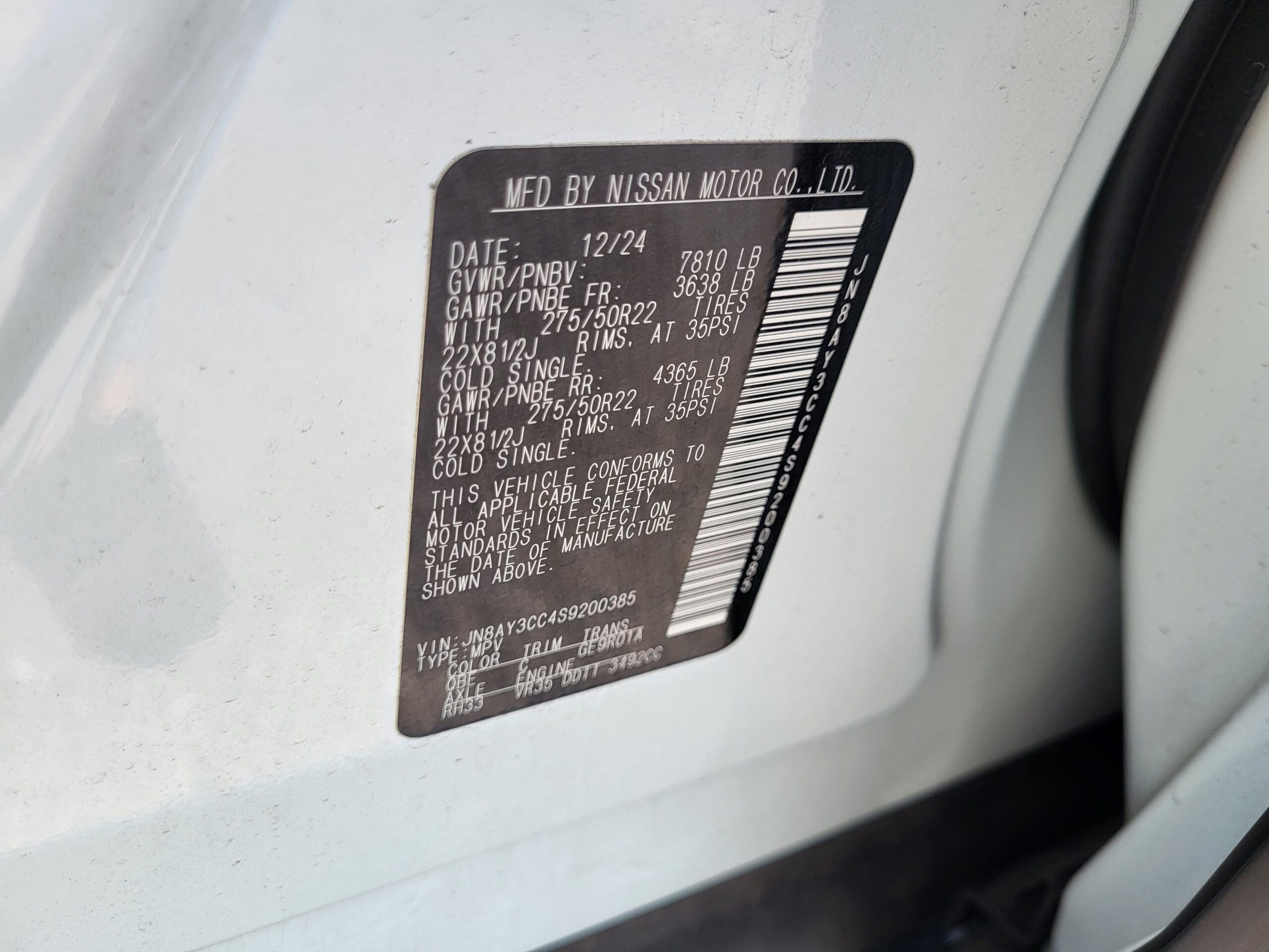 Exterior@Aluminum Spare Wheel~Exterior@Auto On/Off Reflector Led Low/High Beam Daytime Running Auto High-Beam Headlamps w/Delay-Off~Exterior@Black Power w/Tilt Down Heated Side Mirrors w/Driver Auto Dimming, Power Folding and Turn Signal Indicator~Exterior@Body-Colored Door Handles~Exterior@Body-Colored Front Bumper w/Black Rub Strip/Fascia Accent and 1 Tow Hook~Exterior@Body-Colored Rear Bumper w/Black Rub Strip/Fascia Accent and 1 Tow Hook~Exterior@Body-Colored Wheel Well Trim~Exterior@Chrome Side Windows Trim and Black Front Windshield Trim~Exterior@Compact Spare Tire Stored Underbody w/Crankdown~Exterior@Deep Tinted Glass~Exterior@Express Open/Close Sliding And Tilting Glass 1st And 2nd Row Sunroof w/Power Sunshade~Exterior@Fixed Rear Window w/Wiper and Defroster~Exterior@Front fog lamps~Exterior@Front Windshield -inc: Sun Visor Strip~Exterior@Fully Galvanized Steel Panels~Exterior@Grille w/Chrome Bar~Exterior@Headlights-Automatic Highbeams~Exterior@Laminated Glass~Exterior@LED Brakelights~Exterior@Lip Spoiler~Exterior@Perimeter/Approach Lights~Exterior@Power Liftgate Rear Cargo Access~Exterior@Running boards~Exterior@Speed Sensitive Rain Detecting Variable Intermittent Wipers w/Heated Wiper Park~Exterior@Tailgate/Rear Door Lock Included w/Power Door Locks~Exterior@Tires: 22 All Season~Exterior@Wheels: 22 Painted Alloy -inc: Machined finish~Interior@*3rd Row Seating~Interior@*Heated/Cooled Front Seats~Interior@*Moonroof – Glass electric with sunshade~Interior@*Navigation System~Interior@*Rearview Camera~Interior@*Sirius Satellite Radio~Interior@12 Speakers~Interior@2 12V DC Power Outlets~Interior@2 12V DC Power Outlets and 1 Interior 120V AC Power Outlet~Interior@2 LCD Monitors In The Front~Interior@2 Seatback Storage Pockets~Interior@8-Way Driver Seat -inc: Power 4-Way Lumbar Support~Interior@8-Way Passenger Seat -inc: Power 4-Way Lumbar Support~Interior@Air Filtration~Interior@Auto-dimming rearview mirror~Interior@Bucket Folding Bucket Front Facing Heated Manual Reclining Fold Forward Seatback Rear Seat~Interior@Cargo Area Concealed Storage~Interior@Cargo Space Lights~Interior@Carpet Floor Trim~Interior@Climate Controlled Heated & Ventilated Front Seats -inc: memory settings for driver’s seat, massaging seats for driver and front passenger, 12-way power driver’s seat w/4-way power lumbar and 12-way power passenger’s seat w/4-way power lumbar~Interior@Cruise control w/steering wheel controls~Interior@Delayed Accessory Power~Interior@Digital Appearance~Interior@Driver And Passenger Visor Vanity Mirrors w/Driver And Passenger Illumination, Driver And Passenger Auxiliary Mirror~Interior@Driver Foot Rest~Interior@Driver information center~Interior@Dual Zone Front Automatic Air Conditioning w/Front And Rear Infrared~Interior@Fade-To-Off Interior Lighting~Interior@Fixed 60-40 Split-Bench 3rd Row Seat Front, Power Recline, Power Fold Into Floor, 3 Manual and Adjustable Head Restraints~Interior@FOB Controls -inc: Keyfob Cargo Access, Keyfob Window Activation and Keyfob Remote Start~Interior@Front And Rear Map Lights~Interior@Front Center Armrest and Rear Seat Mounted Armrest Outboard Only~Interior@Front Cupholder~Interior@Front Seats w/Leatherette Back Material and Power 4-Way Driver Lumbar~Interior@Full Carpet Floor Covering~Interior@Full Cloth Headliner~Interior@Full Floor Console w/Covered Storage, Mini Overhead Console w/Storage, Rear Console w/Storage, 2 12V DC Power Outlets and 1 Interior 120V AC Power Outlet~Interior@Gauges -inc: Speedometer, Odometer, Voltmeter, Oil Pressure, Engine Coolant Temp, Tachometer, Trip Odometer and Trip Computer~Interior@Head-Up Display~Interior@Heated Leather Steering Wheel w/Auto Tilt-Away~Interior@HVAC -inc: Underseat Ducts and Headliner/Pillar Ducts~Interior@Illuminated Locking Glove Box~Interior@Immobilizer~Interior@Instrument Panel Bin, Driver / Passenger And Rear Door Bins~Interior@Integrated Navigation System w/Voice Activation~Interior@Integrated Roof Antenna~Interior@Intelligent Cruise Control (ICC) w/Full Speed Range and Hold~Interior@Interior Trim -inc: Genuine Wood/Metal-Look Instrument Panel Insert, Metal-Look Console Insert and Piano Black/Metal-Look Interior Accents~Interior@Leather Door Trim Insert~Interior@Manual Anti-Whiplash Adjustable Front Head Restraints and Manual Adjustable Rear Head Restraints~Interior@Memory Settings -inc: Driver Seat, Door Mirrors, Steering Wheel and HVAC~Interior@Mobile Hotspot Internet Access~Interior@myQ Connected Garage Garage Door Transmitter~Interior@Outside temp gauge~Interior@Perimeter alarm~Interior@Power 1st Row Windows w/Front And Rear 1-Touch Up/Down~Interior@Power Door Locks w/Autolock Feature~Interior@Power Rear Windows~Interior@Power Tilt/Telescoping Steering Column~Interior@Proximity Key For Doors And Push Button Start~Interior@Quilted Leather Seat Trim~Interior@Radio w/Seek-Scan, Clock, Speed Compensated Volume Control, Aux Audio Input Jack and Steering Wheel Controls~Interior@Radio: NissanConnect w/SiriusXM 360L -inc: 12 speaker Klipsch audio system, 14.3 center touch-screen display, wireless Apple CarPlay and Android Auto, Google Assistant Maps and Playstore data, Alexa built-in, Nissan door to door connected navigation w/traffic information, Bluetooth hands-free phone system, Bluetooth streaming audio and messaging, voice recognition for audio features, hands-free text messaging assistant, Siri Eyes Free, USB port for compatible devices, advanced audio features, in-car 4G Wi-Fi hotspot and hybrid radio~Interior@Real-Time Traffic Display~Interior@Rear Cupholder~Interior@Rear HVAC w/Separate Controls~Interior@Redundant Digital Speedometer~Interior@Remote Keyless Entry w/Integrated Key Transmitter, 4 Door Curb/Courtesy, Illuminated Entry, Illuminated Ignition Switch and Panic Button~Interior@Remote Releases -Inc: Proximity Cargo Access~Interior@Smart Device Integration~Interior@Tracker System~Interior@Trip computer~Interior@Trunk/Hatch Auto-Latch~Interior@Valet Function~Interior@Wireles